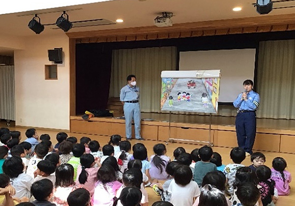 おまわりさんの交通ルールのお話を、真剣に聞いています!
